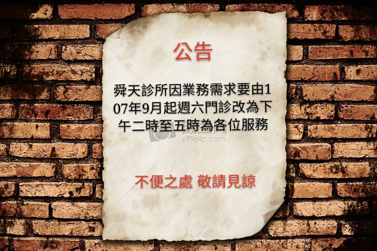 舜天診所因業務需求由107年9月起週六門診改為下午二時至五時為各位服務。不便之處敬請見諒!!